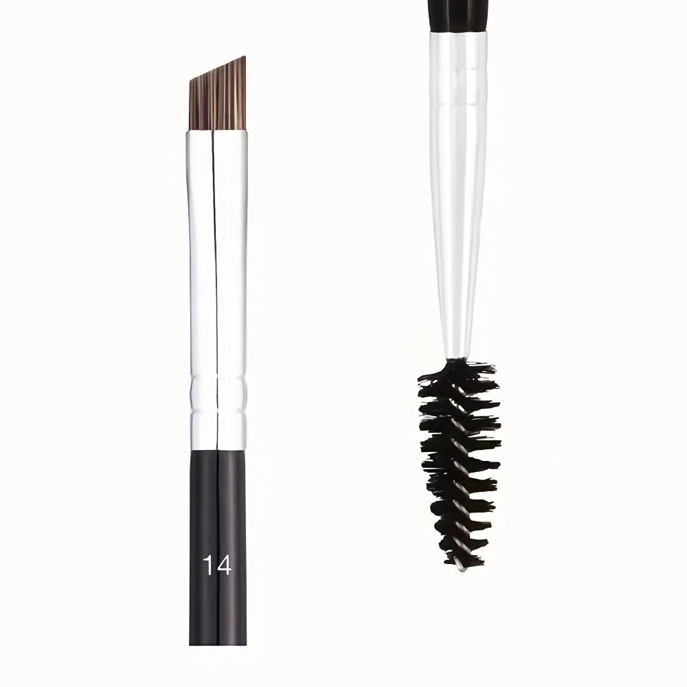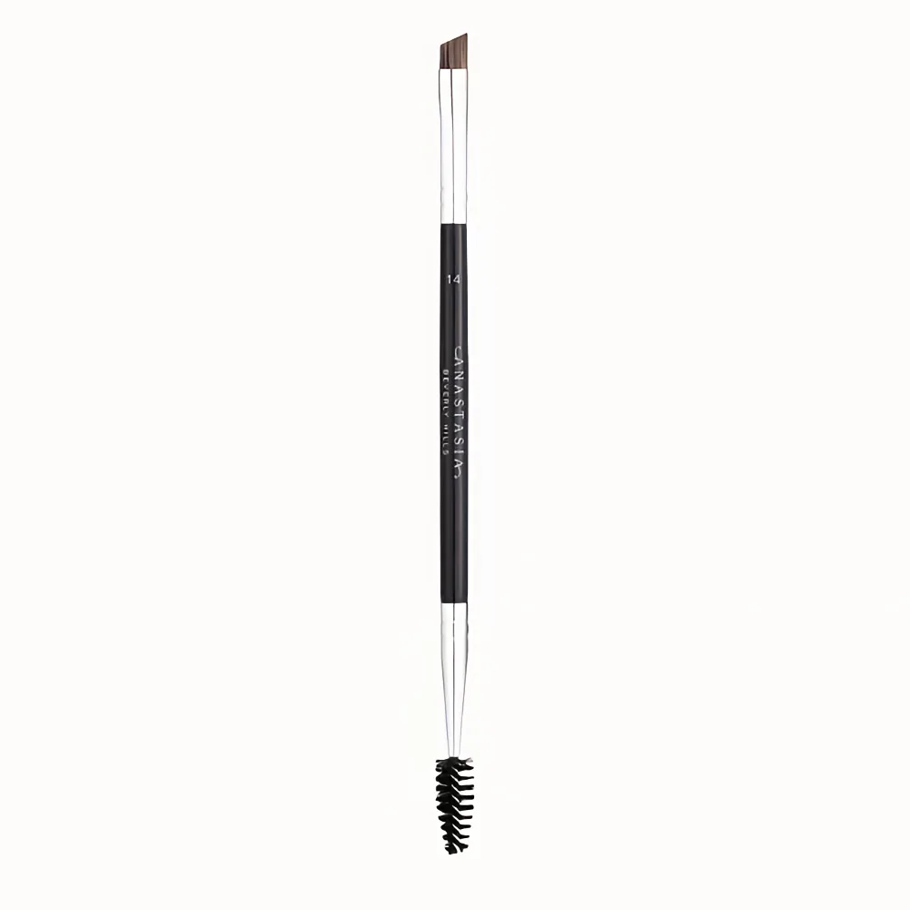 The Anastasia Beverly Hills Brush #14 is a professional dual-ended brow and eyeliner brush designed for precise eyebrow shaping and detailed eye makeup application. It features a firm angled brush on one end and a spoolie brush on the other, making it a versatile tool for filling, defining, and grooming brows.