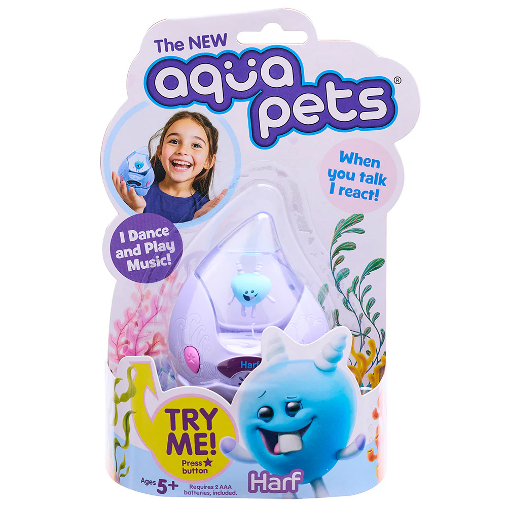 Aquapets Harf is a fun and interactive aquatic toy that lives inside a water-drop container and responds to voice and touch. With cute sounds, dancing movements, and mini games, Harf keeps kids entertained while encouraging interactive and imaginative play.