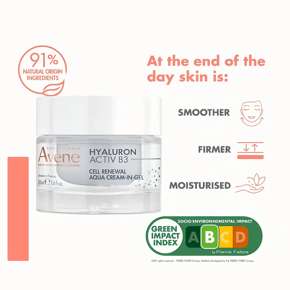 Avène Hyaluron Activ B3 Cell Renewal Aqua Cream-in-Gel 50ml is a lightweight, multi-corrective anti-ageing moisturiser designed to hydrate, smooth, and visibly renew ageing and sensitive skin. Its refreshing gel-cream texture delivers intense moisture while helping to improve skin firmness, texture, and radiance.
