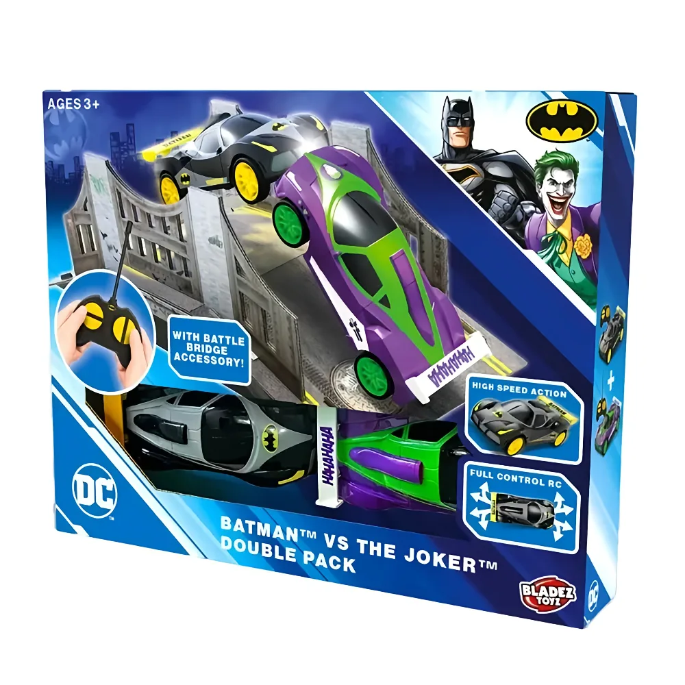 The Bladez RC Batman Vs Joker Double Pack brings the ultimate Gotham rivalry to life with two themed remote control racers. Featuring one Batman car and one Joker car, this exciting set is designed for competitive, side-by-side racing straight out of the box.