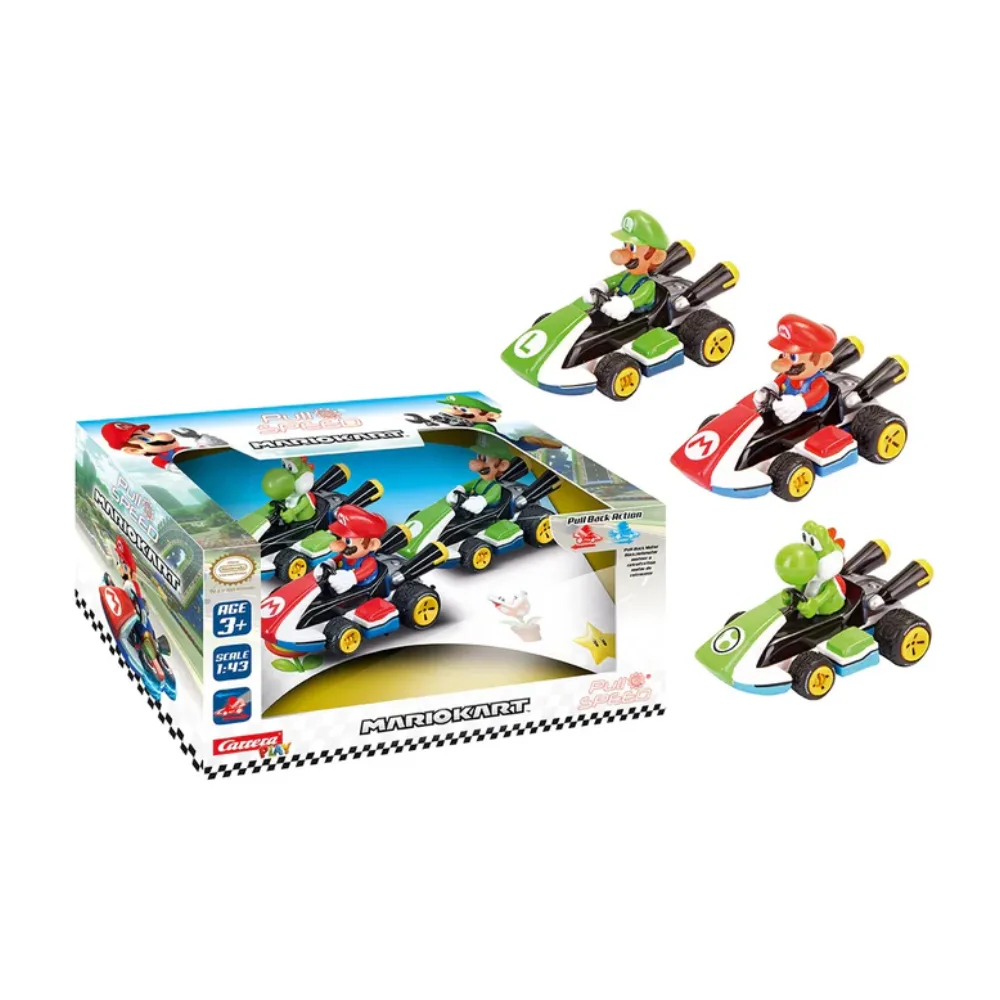 Includes 3 Mario Kart Pull ’N’ Speed racers