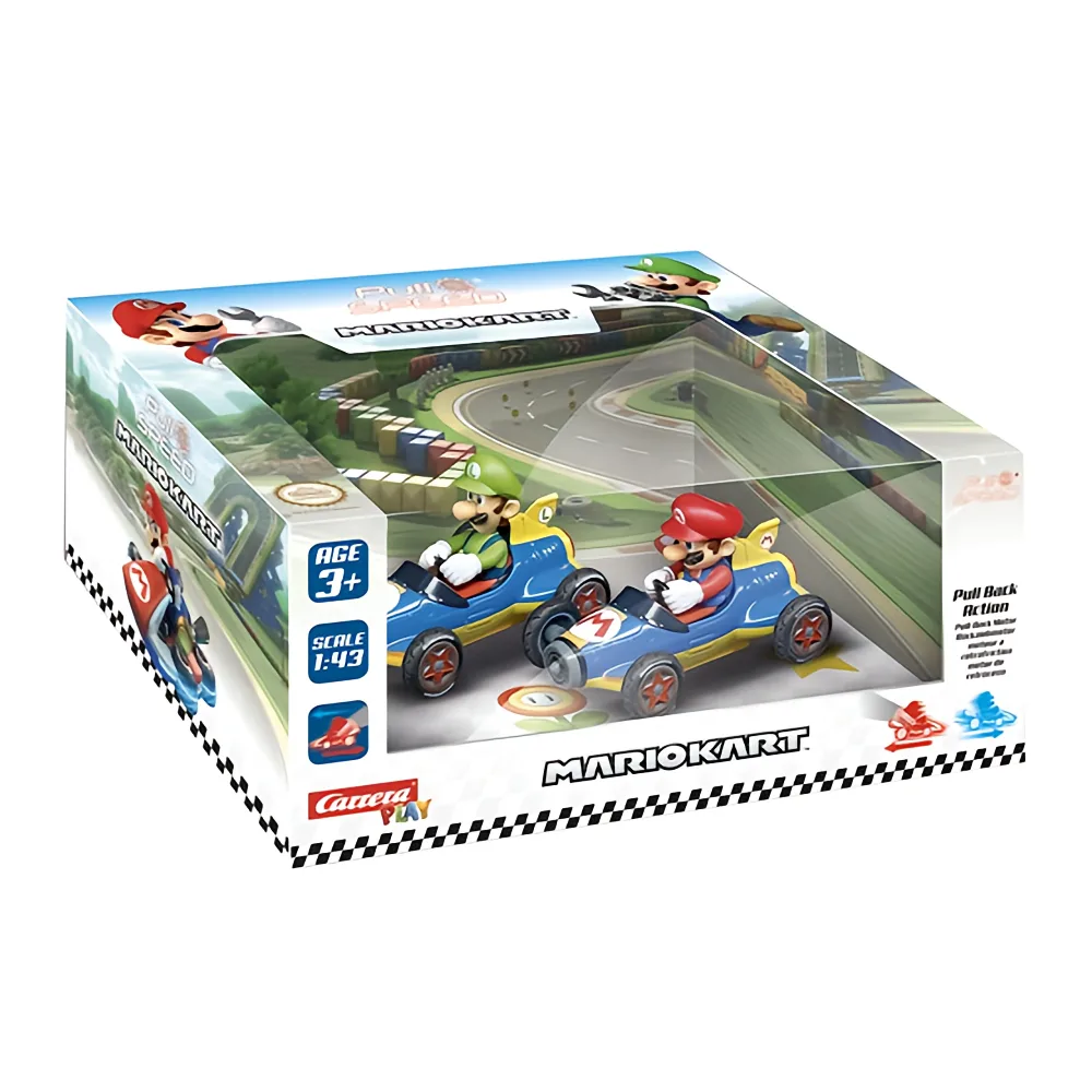 The Carrera Pull & Speed Mario Kart Mach 8 Twin Pack delivers double the racing excitement with two Mach 8–styled Mario Kart vehicles. Designed with detailed character-inspired graphics, this set is perfect for competitive play and friendly racing challenges.