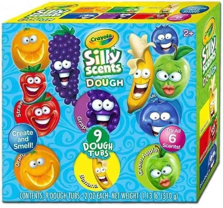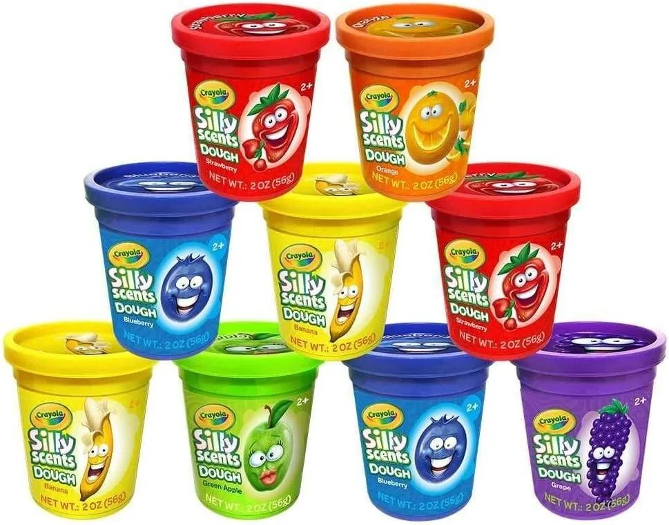Crayola Silly Scents 9-pack dough set (2oz each) with fun colors and fruity scents—perfect for creative, sensory play.