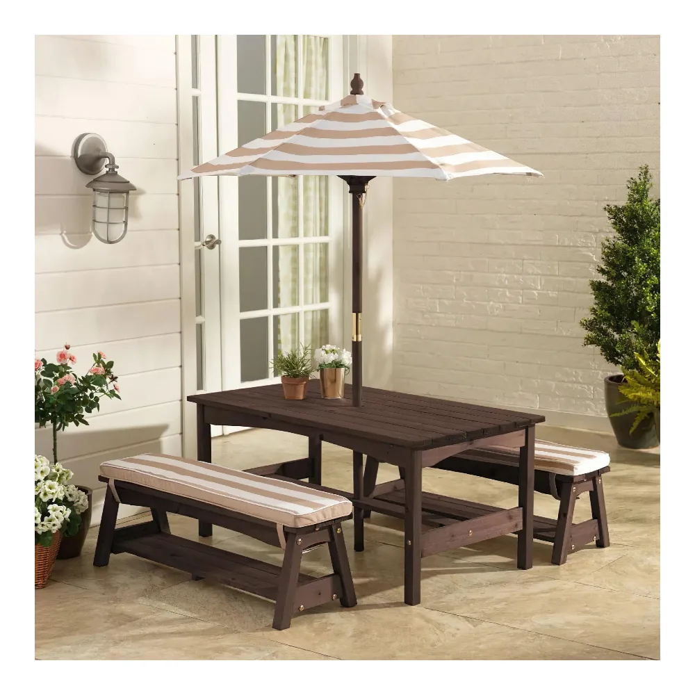 The KidKraft Outdoor Table & Bench Set with Oatmeal & White Striped Cushions is a charming, child-sized outdoor furniture set featuring a sturdy wooden table, two matching benches, and a large adjustable umbrella for shaded play. Perfect for picnics, crafts, or outdoor snacks for children aged 3 and up.