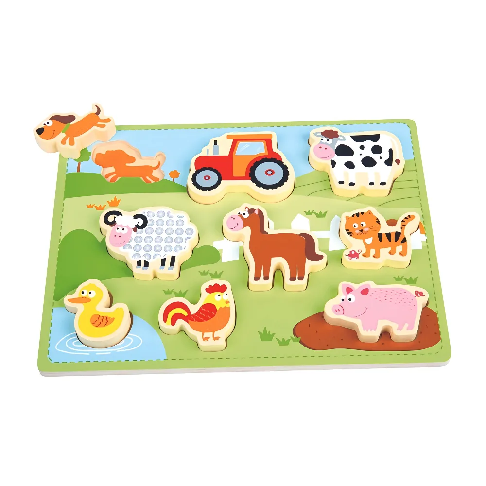 A colorful chunky wooden farm puzzle designed to help toddlers develop motor skills, coordination, and early learning through play.