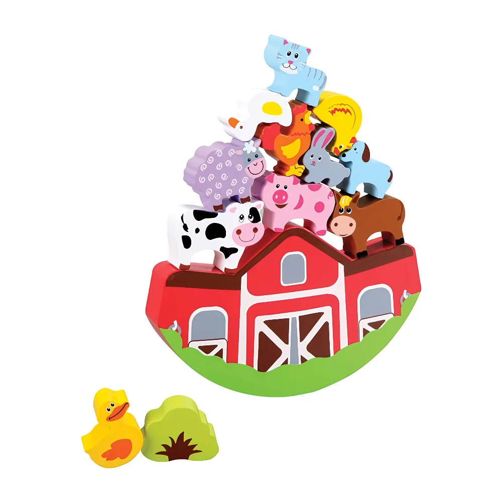 A colorful wooden farm balancing game that helps children develop coordination, focus, and fine motor skills through playful stacking fun.