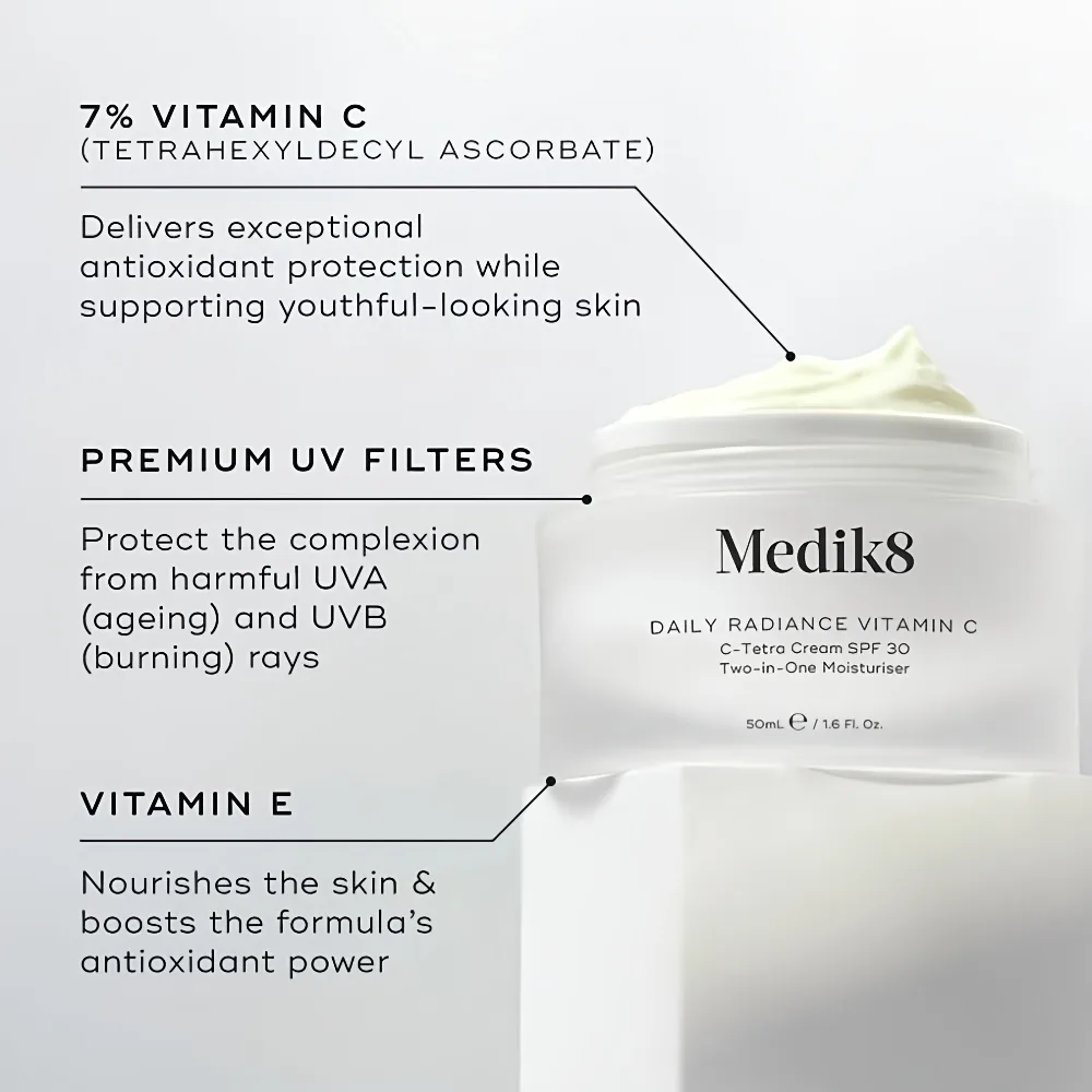 Medik8 Daily Radiance Vitamin C 50 ml is a lightweight daily cream formulated with a stable form of Vitamin C and radiance-boosting ingredients to help enhance skin luminosity and even tone. Designed for everyday use, this brightening cream works to reduce the appearance of dullness and support a clearer, more radiant complexion over time.