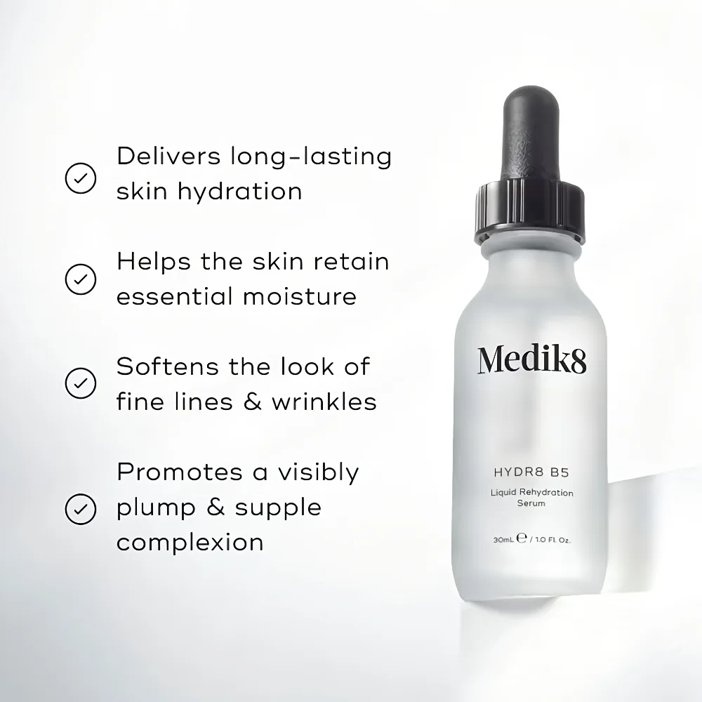 Medik8 Hydr8 B5 Serum 30 ml is a high-performance hydration essential designed to deliver lasting moisture and comfort to all skin types, especially dry or dehydrated skin. This lightweight serum combines multiple forms of hyaluronic acid — a powerful moisture magnet — with vitamin B5 (panthenol) to help attract and bind hydration deep into the skin while supporting its natural barrier.