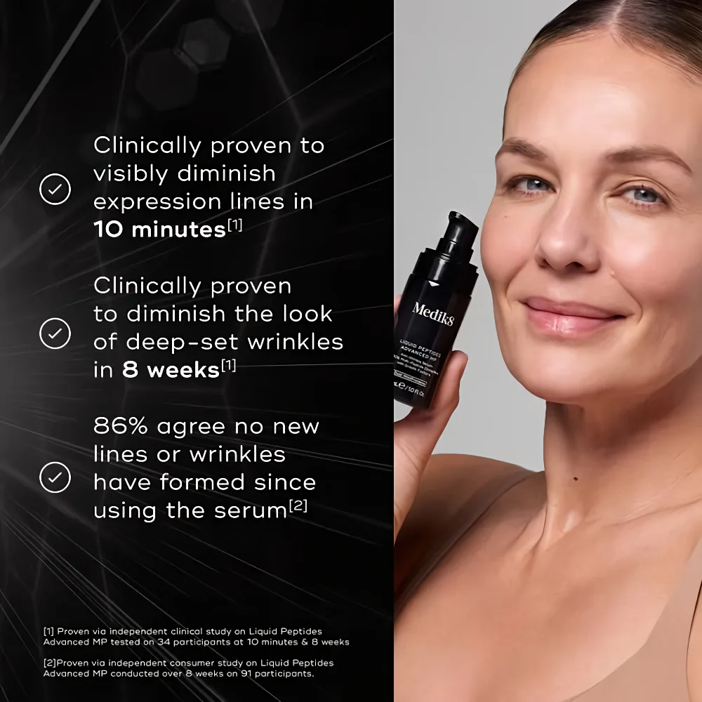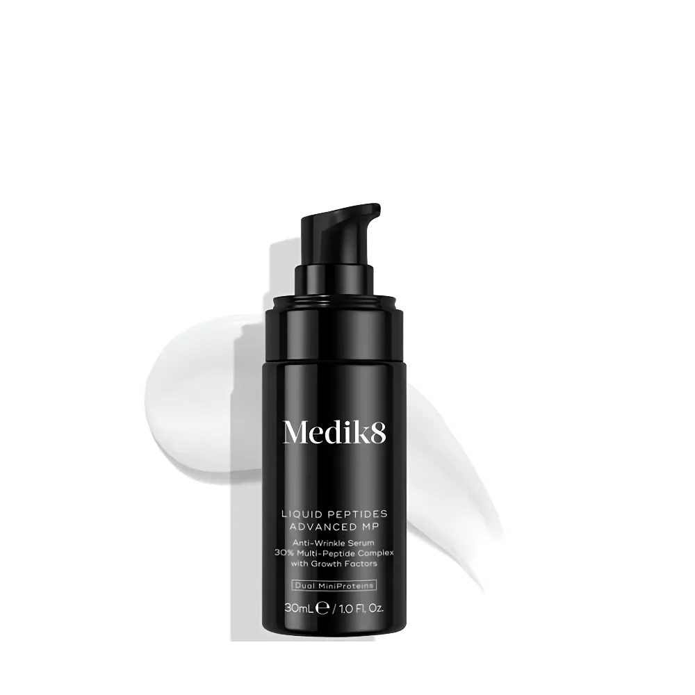 Medik8 Liquid Peptides Advanced MP 30 ml is a high-performance anti-aging serum formulated with a synergistic blend of peptides and advanced actives to help target early signs of aging and support skin resilience. Peptides are amino-acid chains that contribute to the skin’s structural matrix, helping it appear firmer, smoother, and more lifted over time.
