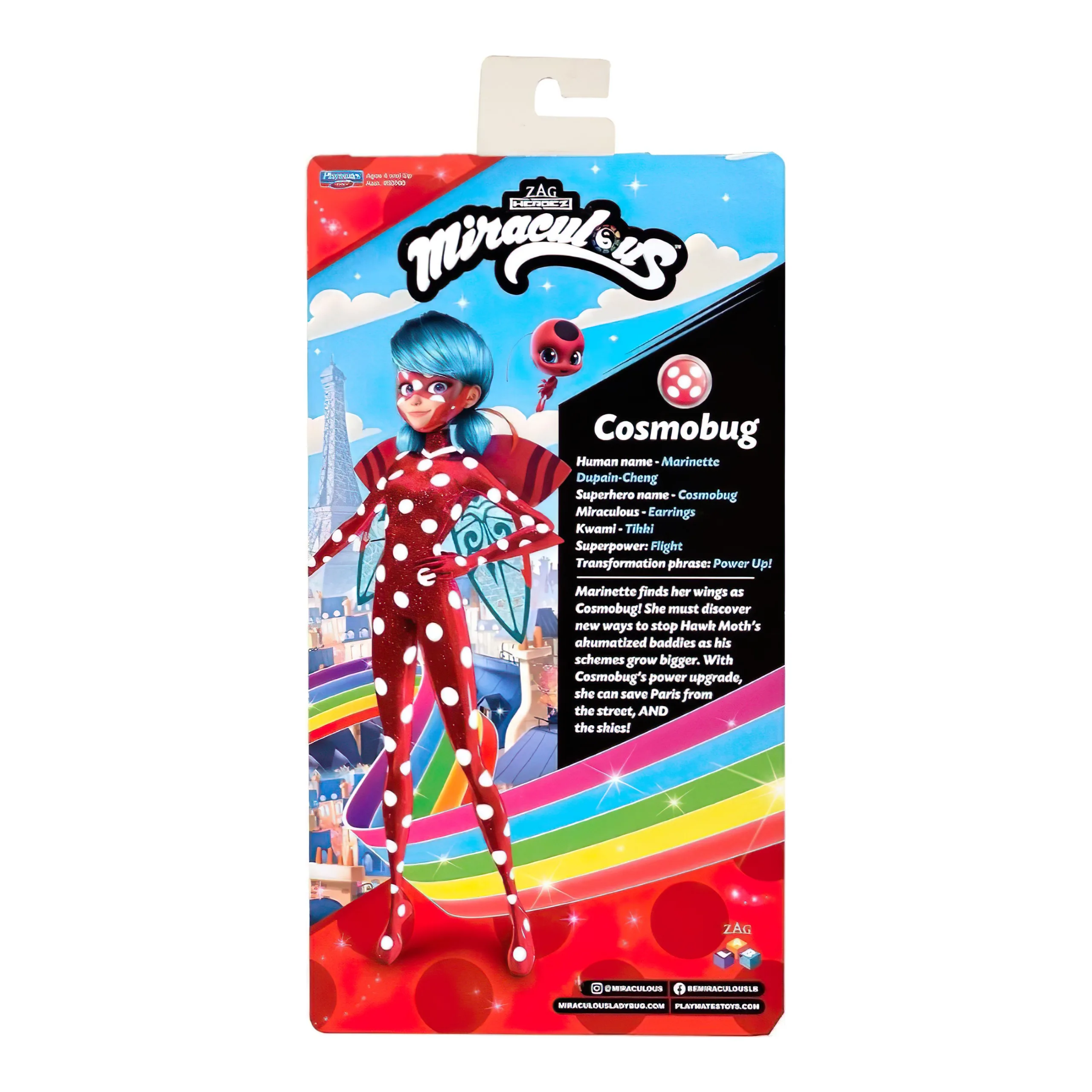 This doll represents Marinette Dupain-Cheng, also known as Ladybug, in her upgraded Cosmobug superhero outfit, complete with detachable wings. The doll features combable hair and comes with accessories, including her sidekick Kwami and her weapon, enhancing imaginative play.