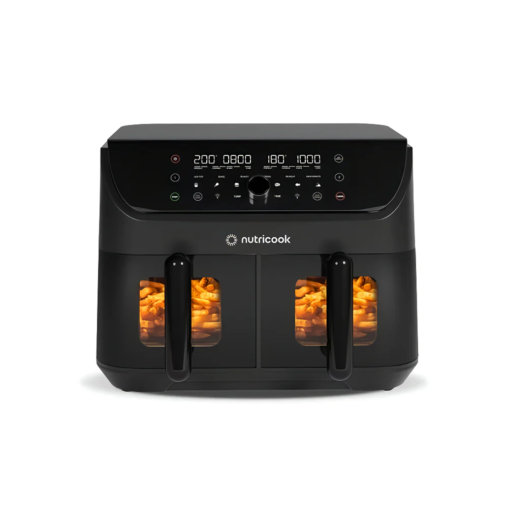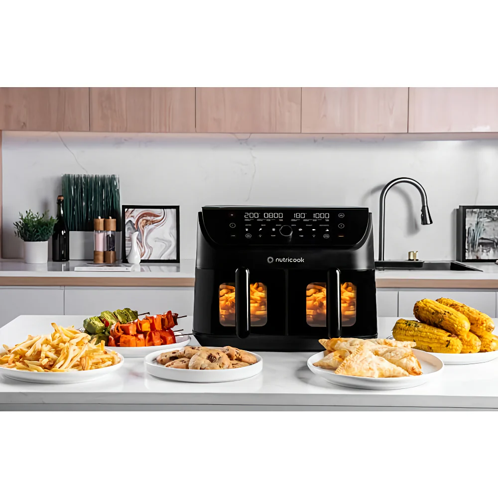 The Nutricook Air Fryer Duo Vision 8.5L is a premium dual-basket air fryer designed for multitasking, large families, and serious home cooks. With two independent 4.25L baskets and a transparent viewing window on each side, you can cook two different dishes at once—and watch them cook in real time without opening the drawers.
