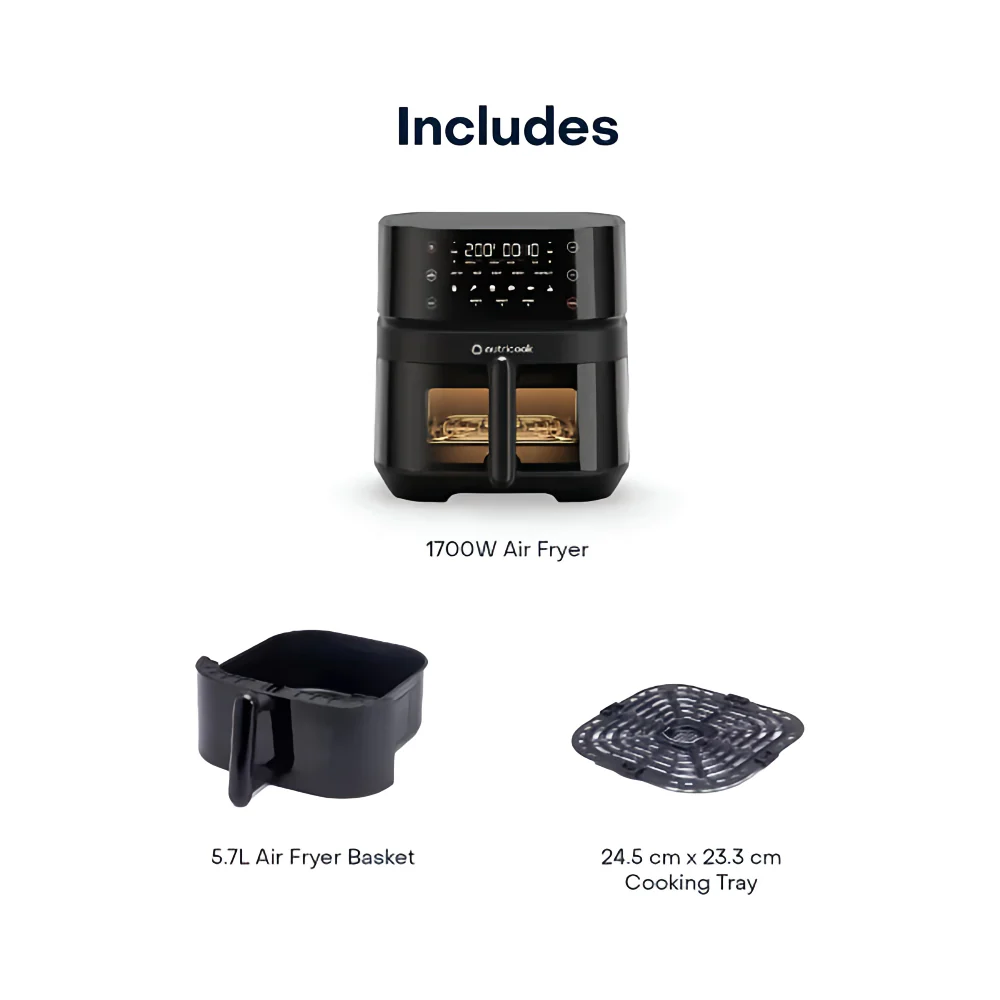 The Nutricook Air Fryer Vision (5.7L) in Black is a versatile, oil-free cooker that delivers crispy, delicious results using rapid air technology. Featuring a viewing window, digital presets, and easy-to-clean parts, it’s perfect for frying, baking, and grilling. Safe, efficient, and stylish—ideal for healthy cooking at home.