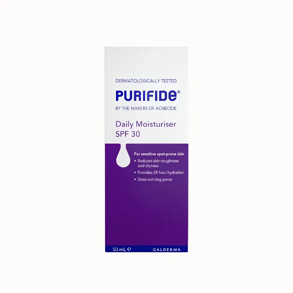 Purifide by Acnecide Daily Moisturiser SPF30 Cream is a lightweight, non-greasy moisturiser designed specifically for blemish-prone and oily skin. It delivers essential hydration while helping to protect against harmful UVA and UVB rays with broad-spectrum SPF30.